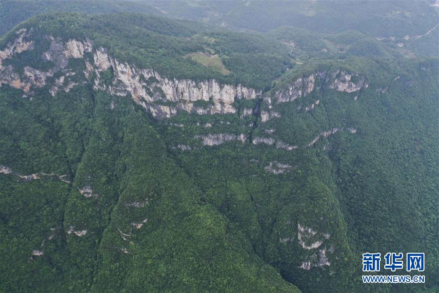 这是6月10日拍摄的“天心眼”绝壁风光(无人机拍摄)。 地处大山深处的湖北省恩施土家族苗族自治州巴东县大支坪镇尚家村,壁立千仞,风光壮美。为改变贫困落后的面貌,今年51岁的村民陈显兵从2017年开始,在村里的支持下,带领群众开始在“天心眼”绝壁上修路,目前已修出了一条几公里长的简易观光山路。乡亲们希望这里的绝壁美景能够被开发,通过发展旅游,带动村民致富。 新华社发(杨顺丕 摄)