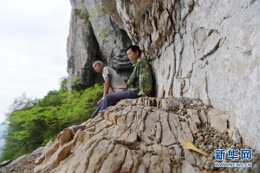 6月10日,陈显兵(右)和村民夏家爱在绝壁上休息。 地处大山深处的湖北省恩施土家族苗族自治州巴东县大支坪镇尚家村,壁立千仞,风光壮美。为改变贫困落后的面貌,今年51岁的村民陈显兵从2017年开始,在村里的支持下,带领群众开始在“天心眼”绝壁上修路,目前已修出了一条几公里长的简易观光山路。乡亲们希望这里的绝壁美景能够被开发,通过发展旅游,带动村民致富。 新华社发(杨顺丕 摄)