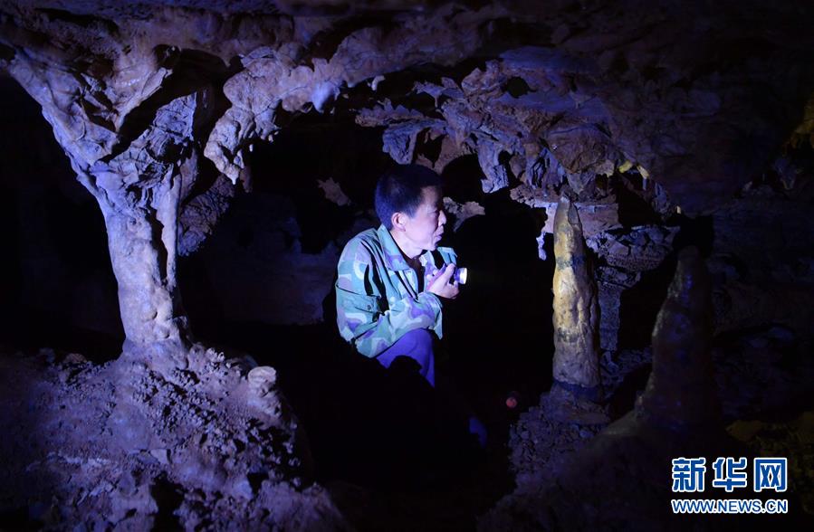 6月10日,陈显兵在悬崖的一处山洞里观察钟乳石。 地处大山深处的湖北省恩施土家族苗族自治州巴东县大支坪镇尚家村,壁立千仞,风光壮美。为改变贫困落后的面貌,今年51岁的村民陈显兵从2017年开始,在村里的支持下,带领群众开始在“天心眼”绝壁上修路,目前已修出了一条几公里长的简易观光山路。乡亲们希望这里的绝壁美景能够被开发,通过发展旅游,带动村民致富。 新华社发(杨顺丕 摄)