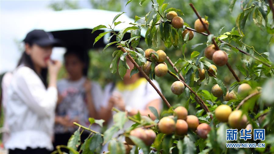 6月11日,游客在钦南区那丽镇殿艮村的“扶贫李园”品尝三华李。 近日,广西钦州市钦南区那丽镇殿艮村种植的三华李进入收获季,吸引游客前来采摘。目前,殿艮村种植的“扶贫李园”共带动16户贫困户实现增收。 新华社记者 张爱林 摄