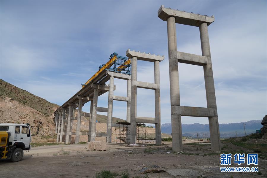 这是5月23日在吉尔吉斯斯坦贾拉拉巴德拍摄的第二特大桥的架梁现场。 新华社记者马晓成摄