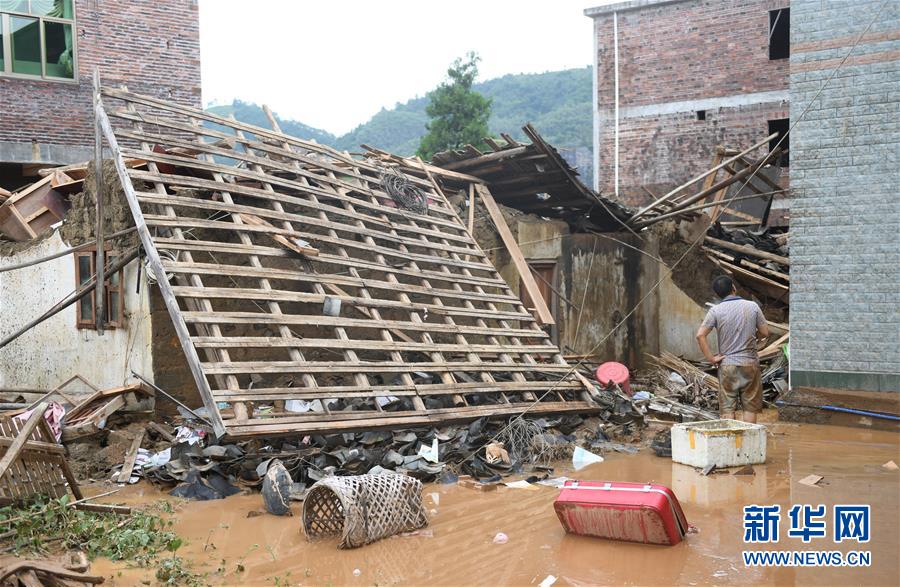 6月11日,在广东省河源市连平县上坪镇下洞村,村民查看受损的房屋。 新华社记者 卢汉欣 摄