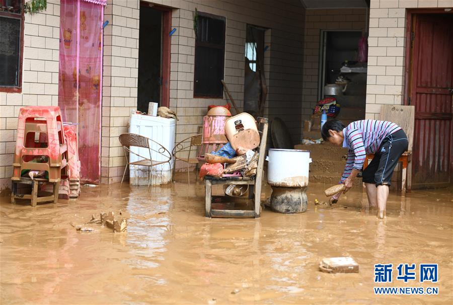 6月11日,在广东省河源市连平县上坪镇下洞村,村民清理院子里的淤泥。 新华社记者 卢汉欣 摄