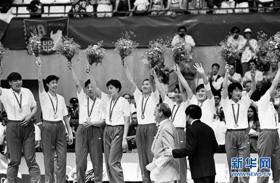 从1959年容国团为新中国获得第一个世界冠军以来,无论是乒乓球、羽毛球、网球等小球运动,还是传统“三大球”项目,都在不断突破,取得辉煌战绩。 1992年8月7日,中国女篮在西班牙巴塞罗那举行的第25届奥运会决赛中获得银牌。图为队员们站在领奖台上向观众致意。 新华社记者程至善摄