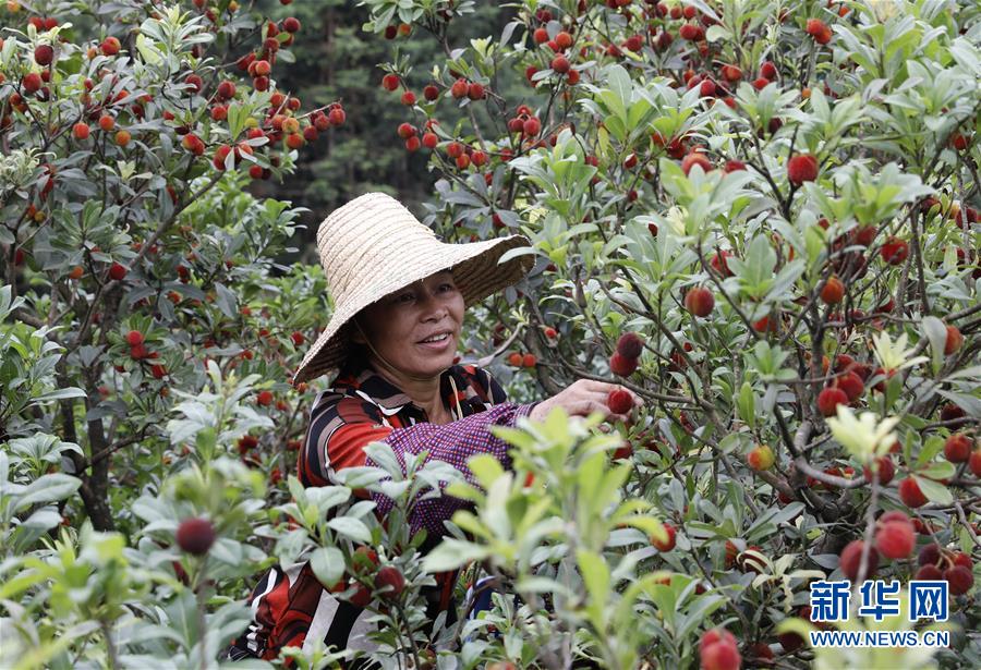 6月11日,在广西罗城仫佬族自治县宝坛乡西华村杨梅果场,村民在采摘杨梅。 当日,广西河池市罗城仫佬族自治县宝坛乡西华村1200多亩杨梅园正式开园采摘,吸引众多果商前来订购。 新华社发(廖光福 摄)