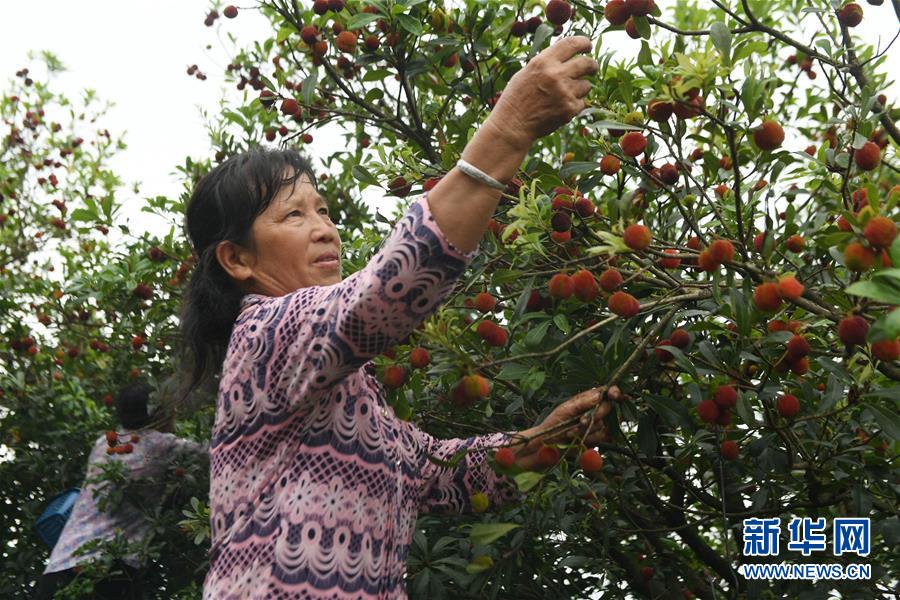 6月11日,在广西罗城仫佬族自治县宝坛乡西华村杨梅果场,村民在采摘杨梅。 当日,广西河池市罗城仫佬族自治县宝坛乡西华村1200多亩杨梅园正式开园采摘,吸引众多果商前来订购。 新华社发(韦如代 摄)