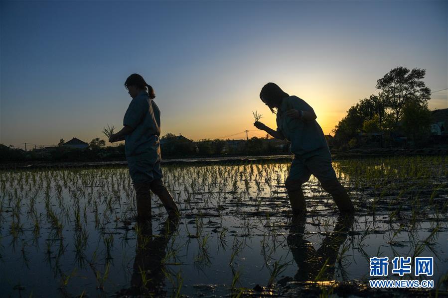 5月29日,陆晓泉(右)与王超平进行水稻补苗工作。新华社记者 张楠摄