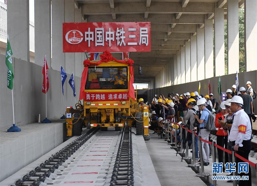 6月12日,铺轨机在京张高铁清华园隧道进行铺轨作业。 当日上午,京张高铁最后一根钢轨在中铁三局WZ-500型无砟轨道铺轨机牵引下准确落在清华园隧道的枕木上,精调之后,轨距误差在正负1毫米之内。铺轨历时7个月后,被誉为中国铁路发展“集大成者”、智能高铁示范工程的京张高铁实现全线轨道贯通。 新华社记者 张晨霖 摄