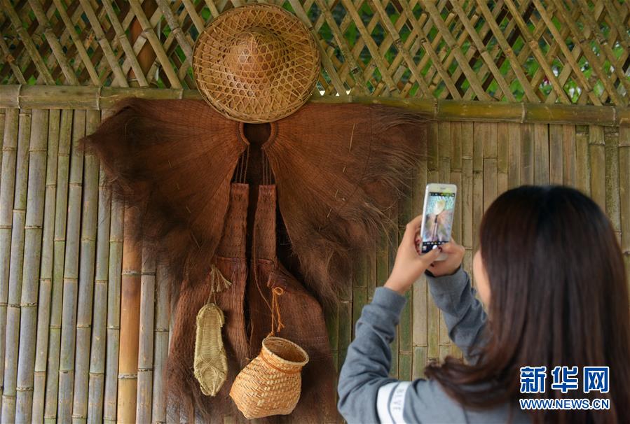 6月12日,一名游客在湖北省宣恩县珠山镇狮子关村的土家竹楼里拍摄蓑衣。 新华社发(王俊 摄)