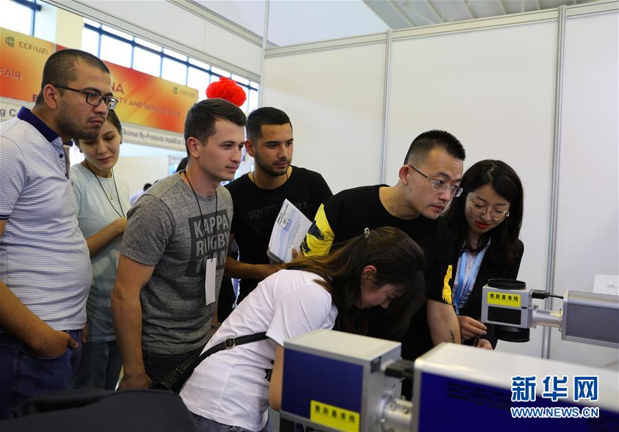 6月12日,在乌兹别克斯坦首都塔什干国家会展中心,中方参展商在为乌方人员展示设备操作。 首届中国商品和服务展12日在乌兹别克斯坦首都塔什干开幕,为促进乌中经贸往来和企业合作搭建平台。 新华社记者 蔡国栋 摄