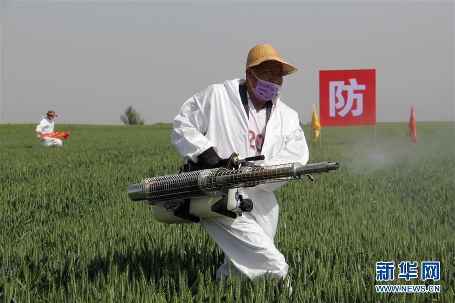 陕西省西安市长安区新街北村的农技人员实施喷洒农药作业(4月25日摄)。 新华社发