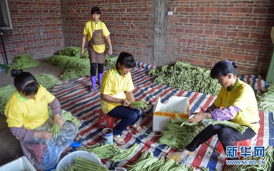 6月12日,在钦州市钦南区那思镇,当地群众在整装“山泉豆角”。近年来,广西钦州市钦南区那思镇实施“一村一品”工程,该镇种植的2000多亩“山泉豆角”带动贫困种植户逐步增收。新华社记者 张爱林 摄