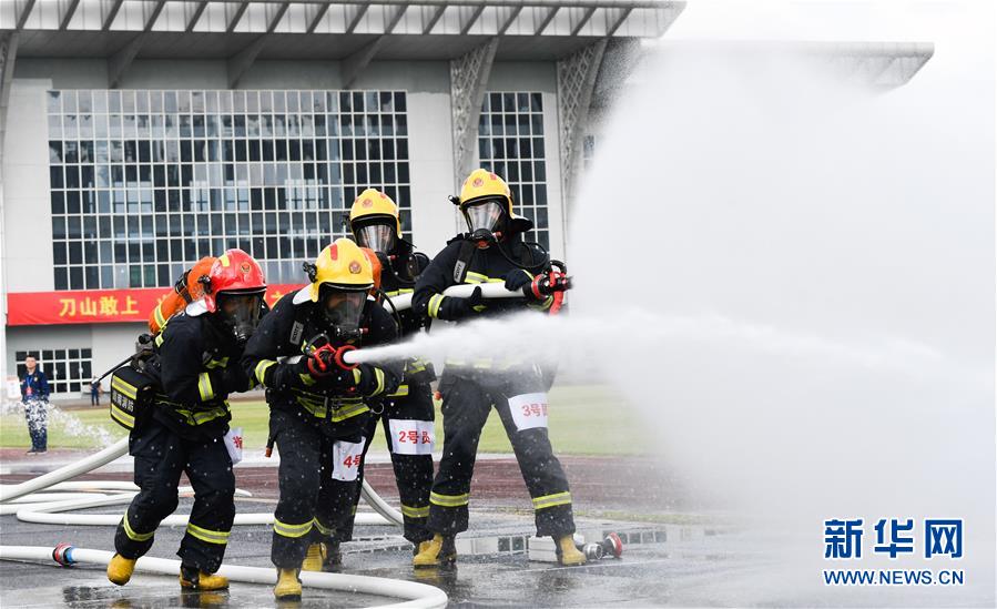 6月12日,消防员在比武中。 当日,海南省消防救援总队在海南省消防培训基地举行2019年海南省消防救援总队全员岗位大练兵比武竞赛,来自全省的27支消防救援代表队和12支专职消防代表队展开角逐。 新华社记者 杨冠宇 摄