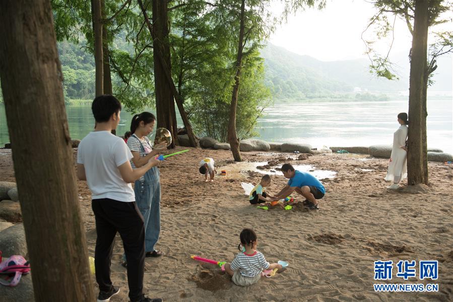 6月11日,市民在建德市新安江畔的沙滩上休闲纳凉。 近日,位于浙江建德主城区的新安江大城区慢行系统一期工程正式交付使用。该慢行系统包括绿道及周围水系、沙滩等,成为市民夏日休闲好去处。 新华社记者 翁忻旸 摄