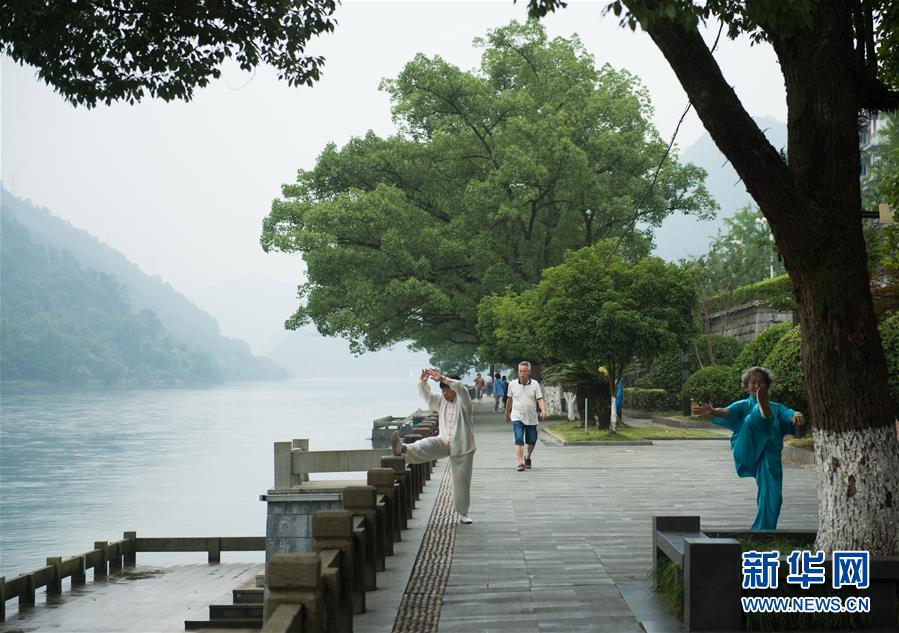 6月12日,市民在建德市新安江畔的绿道上晨练。 近日,位于浙江建德主城区的新安江大城区慢行系统一期工程正式交付使用。该慢行系统包括绿道及周围水系、沙滩等,成为市民夏日休闲好去处。 新华社记者 翁忻旸 摄