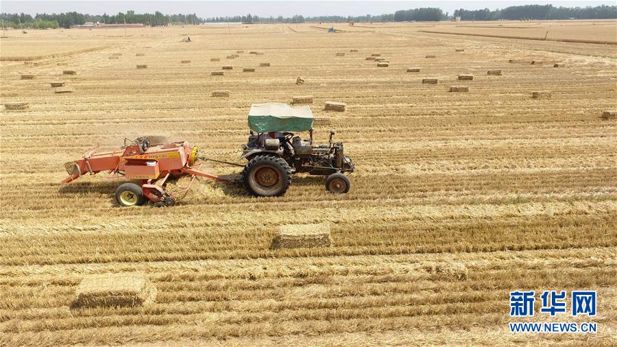6月12日,在山东省聊城市茌平县贾寨镇王药包村,村民驾驶农机进行小麦秸秆打捆作业。新华社发(赵玉国 摄)