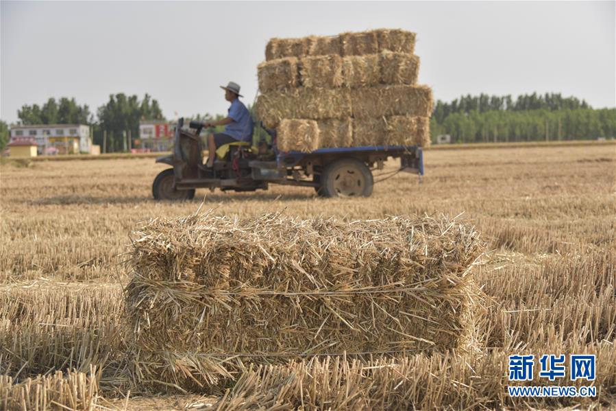 6月11日,在山东省聊城市茌平县贾寨镇卢吴村,村民将打捆的小麦秸秆装车运出。新华社发(赵玉国 摄)