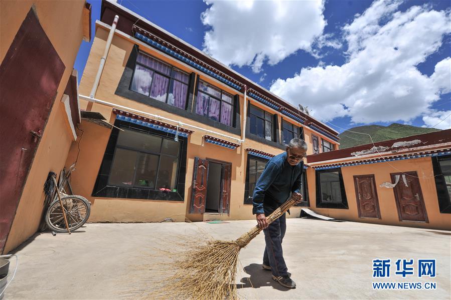 加塔在打扫新居的庭院(6月12日摄)。 西藏那曲市索县荣布镇是那曲市特色民俗小城镇建设示范点,今年75岁的加塔老人的新家就安在这里。加塔于2018年底告别住了大半辈子的老房子,搬进了崭新的二层藏式楼房。 新华社记者 晋美多吉 摄