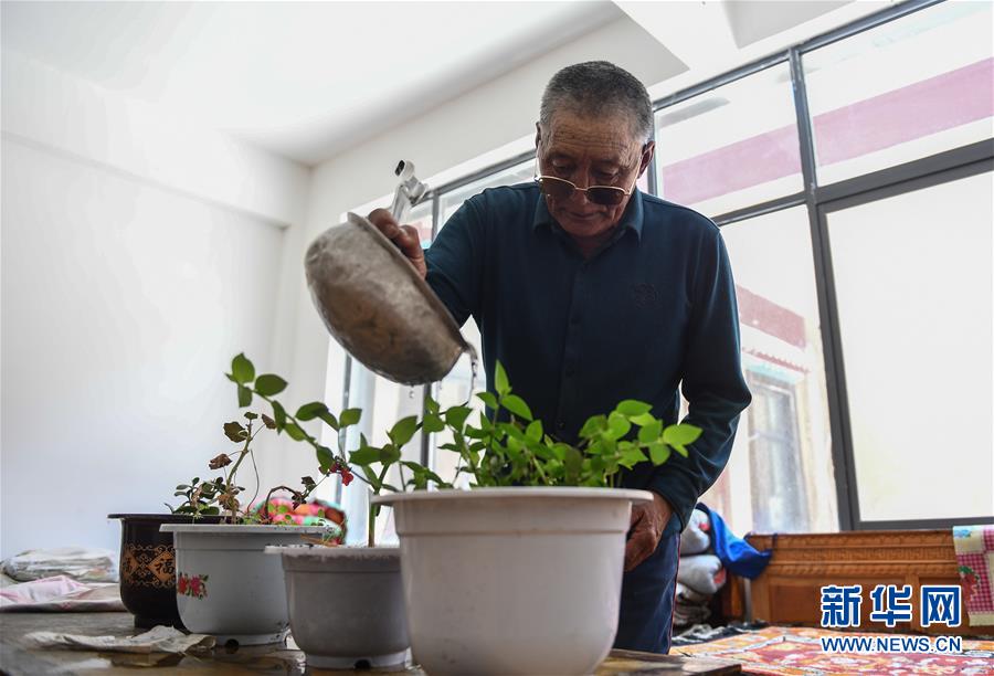 加塔在新房子里给花浇水(6月12日摄)。 西藏那曲市索县荣布镇是那曲市特色民俗小城镇建设示范点,今年75岁的加塔老人的新家就安在这里。加塔于2018年底告别住了大半辈子的老房子,搬进了崭新的二层藏式楼房。 新华社记者 晋美多吉 摄