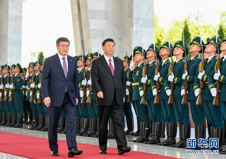 6月13日,国家主席习近平在比什凯克同吉尔吉斯斯坦总统热恩别科夫会谈。会谈前,热恩别科夫在阿拉尔恰国宾馆会议中心前广场为习近平举行隆重欢迎仪式。这是两国元首检阅仪仗队。 新华社记者 高洁 摄
