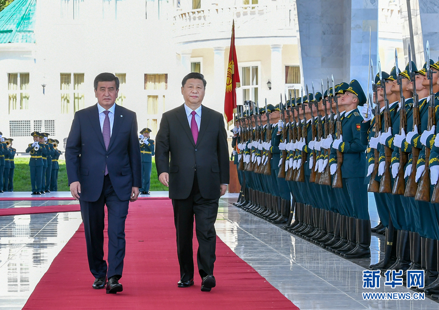 习近平乘车抵达广场时,受到热恩别科夫热情迎接。两国元首登上检阅台。军乐团奏中吉两国国歌。两国元首检阅仪仗队。习近平行至仪仗队中央,用吉尔吉斯语向仪仗队员问候:战士们好!仪仗队员用吉尔吉斯语回答:欢迎您!习近平同热恩别科夫共同观看了分列式。