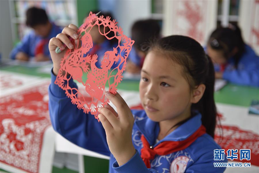 6月13日,大漫港小学学生在检查自己的剪纸作品。 近年来,位于河北省唐山市丰润区李钊庄镇的大漫港小学将剪纸、皮影等传统技艺引进校园,通过开设传统技艺表演课程、聘请民间艺人等方式,让学生感受传统技艺的魅力。 新华社发(刘满仓 摄)