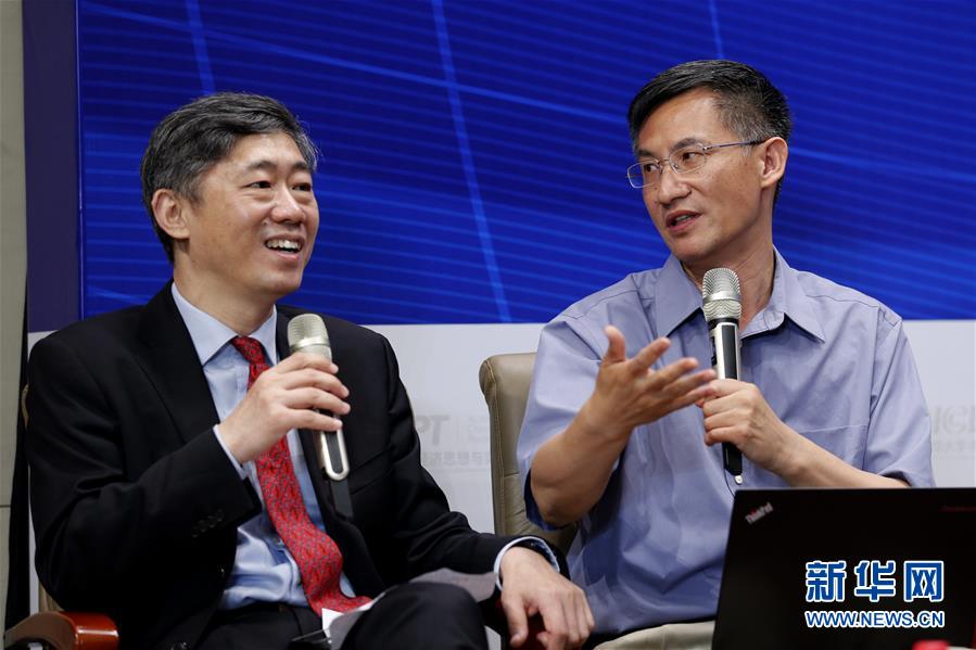 6月13日,清华大学中国经济思想与实践研究院院长李稻葵(左)和清华大学国家金融研究院国际金融与经济研究中心主任鞠建东在研讨会上交流。 新华社记者 张玉薇 摄