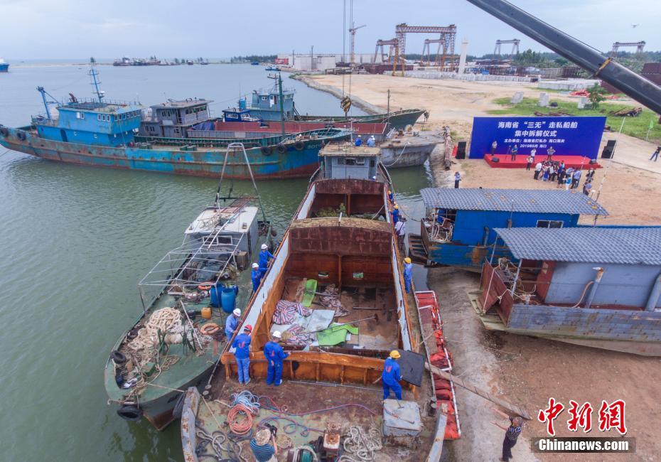 6月14日,航拍集中拆解“三无”走私船舶现场。当日,海南省打私办联合海口海关在海口市对14艘“三无”(无船名船号、无船舶证书、无船籍港)走私船舶进行集中公开拆解处理,这是海南建省以来集中拆解“三无”走私船舶规模最大的一次。中新社记者 骆云飞 摄