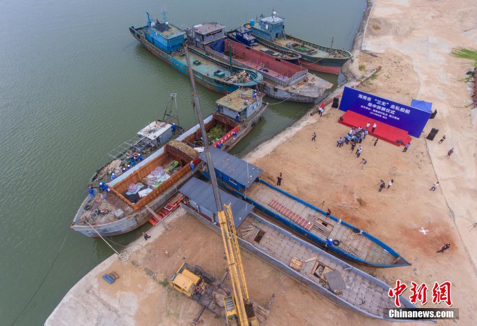 6月14日,航拍集中拆解“三无”走私船舶现场。当日,海南省打私办联合海口海关在海口市对14艘“三无”(无船名船号、无船舶证书、无船籍港)走私船舶进行集中公开拆解处理,这是海南建省以来集中拆解“三无”走私船舶规模最大的一次。中新社记者 骆云飞 摄