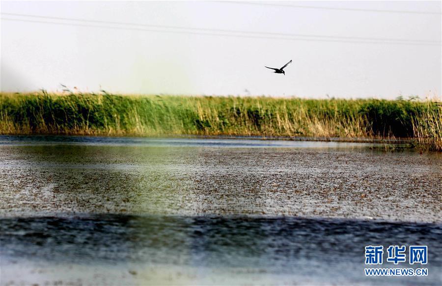 一只候鸟在青土湖水面飞翔(6月13日摄)。 位于巴丹吉林沙漠和腾格里沙漠夹缝中的青土湖,是甘肃省武威市民勤县的“沙漠之湖”,也是当地生态变迁的“晴雨表”。2010年以来,当地连续9年有计划地向青土湖下泄生态用水,累计下泄水量2.5亿立方米。目前,曾一度干涸的青土湖已形成旱区湿地106平方公里和约26平方公里的湖面,日益成为当地的一道生态屏障。 新华社记者 郭刚 摄