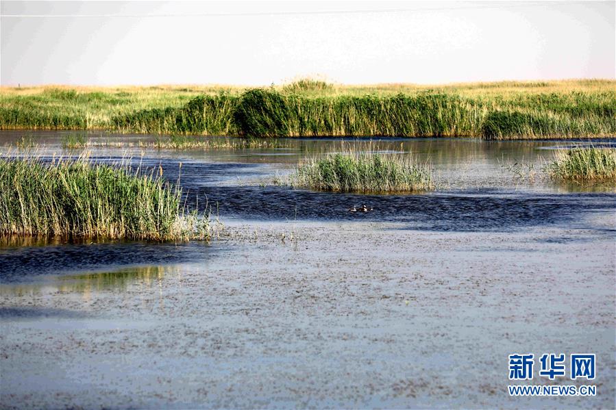 野生水鸟在青土湖中心水面游过(6月13日摄)。 位于巴丹吉林沙漠和腾格里沙漠夹缝中的青土湖,是甘肃省武威市民勤县的“沙漠之湖”,也是当地生态变迁的“晴雨表”。2010年以来,当地连续9年有计划地向青土湖下泄生态用水,累计下泄水量2.5亿立方米。目前,曾一度干涸的青土湖已形成旱区湿地106平方公里和约26平方公里的湖面,日益成为当地的一道生态屏障。 新华社记者 郭刚 摄