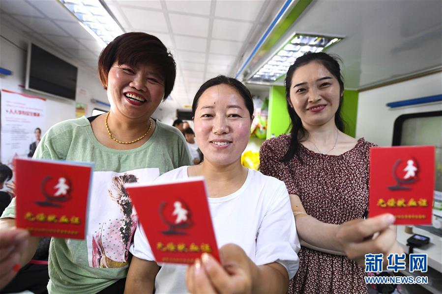 6月14日,献血者在安徽省亳州市一采血车上展示无偿献血证。 当日是世界献血者日,今年的主题是“人人享有安全血液”。 新华社发(刘勤利 摄)