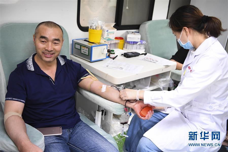 6月14日,献血者在安徽省亳州市一采血车上献血。 当日是世界献血者日,今年的主题是“人人享有安全血液”。 新华社发(刘勤利 摄)