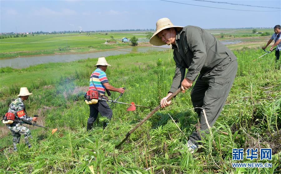 6月14日,在江西省南昌市南昌县南新乡,防汛人员在清理影响巡查的杂草、灌木。 受前期持续强降雨影响,加上赣江上游来水,赣江南昌县境内水位迅速上涨。江西省南昌县启动防汛Ⅳ级应急响应,当地防汛人员24小时不间断巡查排险,清理影响巡查的杂草、灌木,储备防汛物资,力保大堤安全。 新华社记者 彭昭之 摄