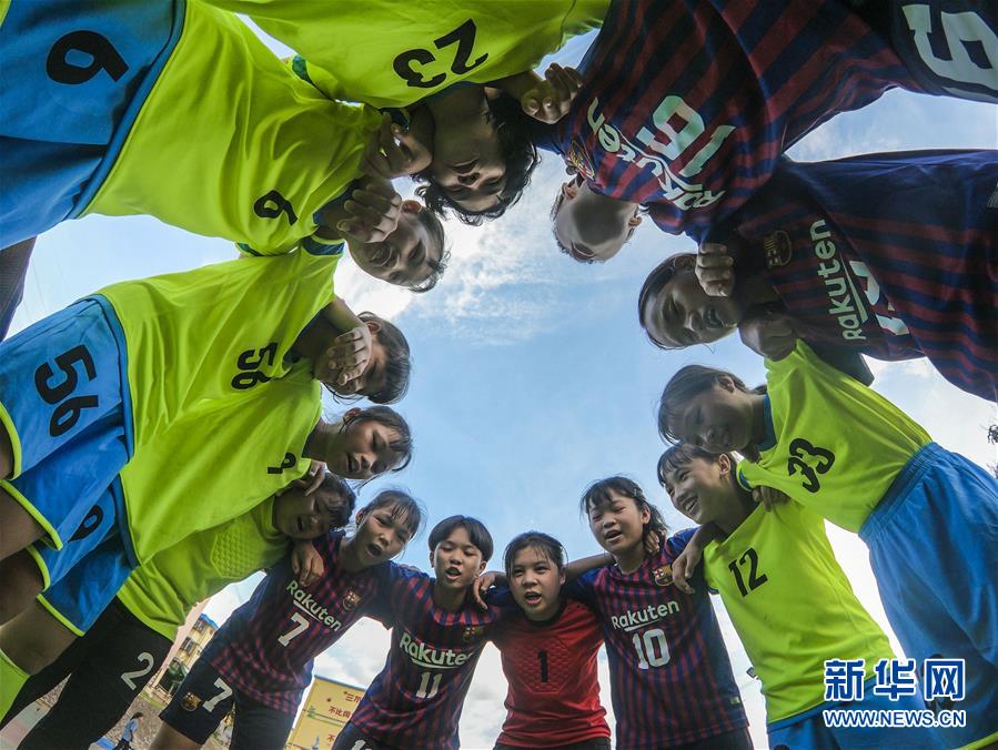 6月13日,在防城港市上思县华兰镇九年制学校,女子足球队队员在训练结束后互相加油鼓劲。 广西防城港市上思县华兰镇九年制学校地处十万大山腹地,这里有一支27名初中生组成的女子足球队。虽然学校训练场地有限,队员们只能在篮球场上开展日常足球训练,但并不影响她们对足球运动的喜爱。每天她们利用课余时间进行足球技战术练习。夏日的骄阳下,队员们挥汗如雨,为实现自己的足球梦努力。 新华社发(刘峥 摄)