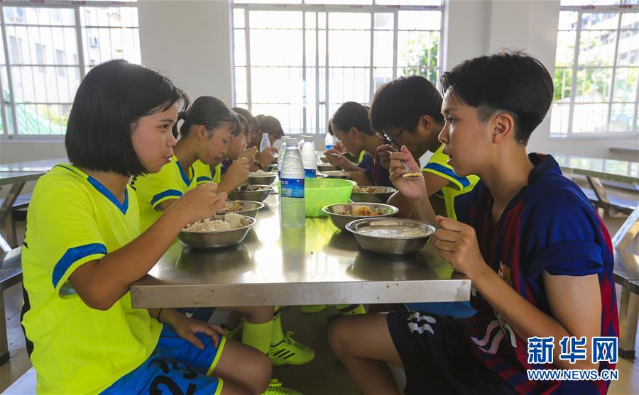 6月13日,在防城港市上思县华兰镇九年制学校,女子足球队队员训练后在食堂吃饭。 广西防城港市上思县华兰镇九年制学校地处十万大山腹地,这里有一支27名初中生组成的女子足球队。虽然学校训练场地有限,队员们只能在篮球场上开展日常足球训练,但并不影响她们对足球运动的喜爱。每天她们利用课余时间进行足球技战术练习。夏日的骄阳下,队员们挥汗如雨,为实现自己的足球梦努力。 新华社发(刘峥 摄)