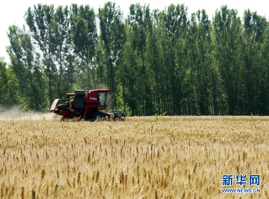 6月14日,河北唐山遵化市东新庄镇后毛庄村农民在收割小麦。 据河北省农业农村厅统计,今年河北小麦播种面积3460.6万亩,适宜机收面积3430万亩,河北小麦机收时间从6月6日开始,预计到6月22日前后结束。 新华社发(刘满仓 摄)