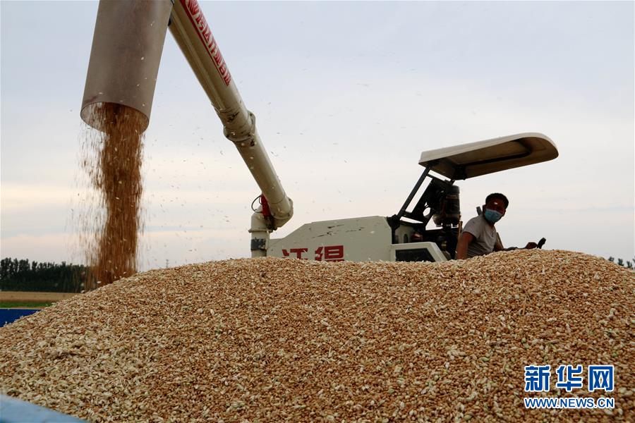 6月13日,农民在河北省永清县大强村麦田里收获小麦。 据河北省农业农村厅统计,今年河北小麦播种面积3460.6万亩,适宜机收面积3430万亩,河北小麦机收时间从6月6日开始,预计到6月22日前后结束。 新华社发(李丙辉 摄)