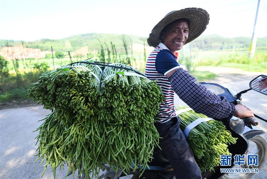 6月14日,在柳州市鱼峰区白沙镇王眉村,村民准备将刚采摘的豆角运送到村里的流动收购点。 日前,广西柳州市鱼峰区种植的5000多亩豆角迎来丰收,田间地头一派忙碌的采摘景象。近年来,柳州市鱼峰区大力发展豆角、竹笋、螺蛳等螺蛳粉原材料的种植、养殖,目前已有900多户贫困户参与其中。螺蛳粉原材料产业逐渐成为当地农民脱贫增收的主导产业。 新华社发(黎寒池 摄)