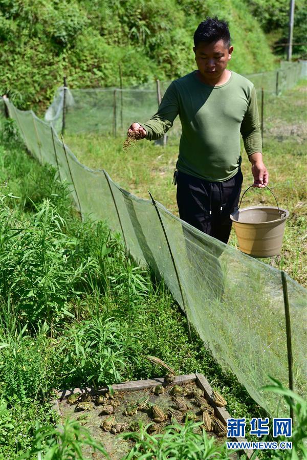 6月14日,在丹寨县排调镇甲石村的青蛙养殖基地,杨胜华在给青蛙投食。