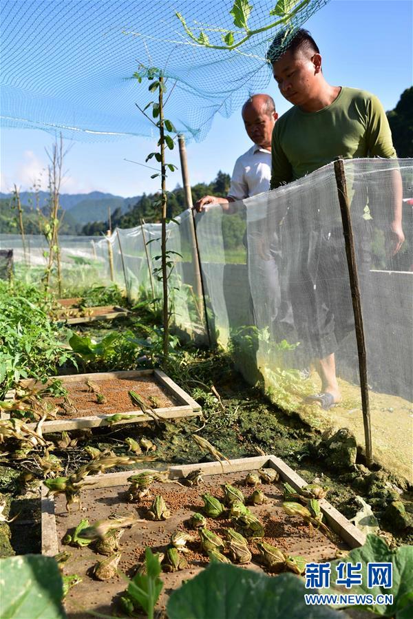 6月14日,在丹寨县排调镇甲石村的青蛙养殖基地,杨胜华(前)和村民在查看青蛙生长情况。