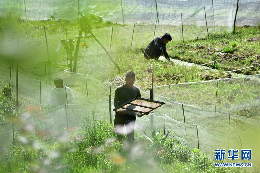 6月14日,在丹寨县排调镇甲石村,村民在青蛙养殖基地里进行管护。