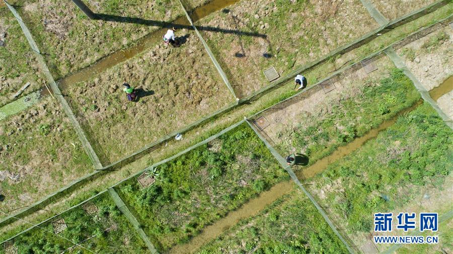 6月14日,在丹寨县排调镇甲石村,村民在青蛙养殖基地里进行管护(无人机航拍)。