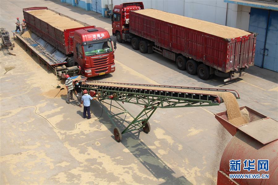6月14日,在山东省滨州市一处粮食收购点,工作人员将小麦卸车入库。 近日,各地夏粮收购工作陆续展开。 新华社发(初宝瑞 摄)