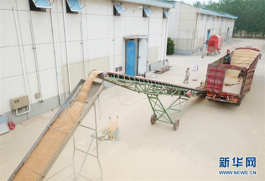 6月14日,在江苏省连云港市海州区新坝镇一处粮食收购点,工作人员在收购夏粮。 近日,各地夏粮收购工作陆续展开。 新华社发(耿玉和 摄)
