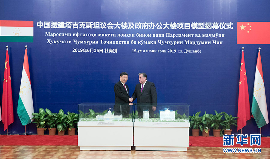 6月15日,国家主席习近平在杜尚别同塔吉克斯坦总统拉赫蒙会谈。会谈后,两国元首共同出席中方援塔议会大楼、政府办公大楼项目模型揭幕仪式。 新华社记者 王晔 摄