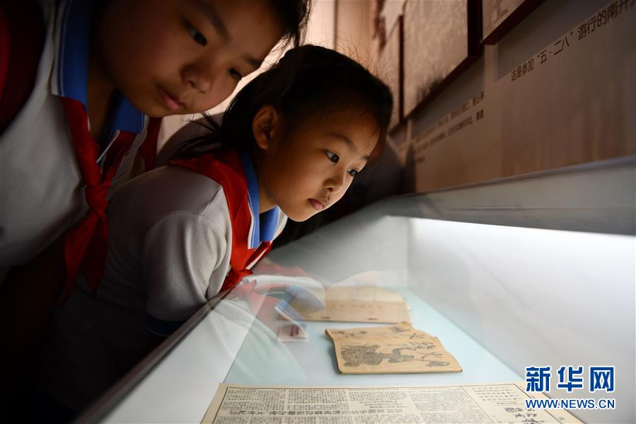 6月15日,同学们在天津“一二·九”抗日救亡运动纪念馆参观展览柜内摆放的书刊。 当日,天津市西青区王兰庄中心小学组织学生代表来到天津“一二·九”抗日救亡运动纪念馆开展爱国主义教育课外活动,由部分学生组成讲解团,给同学讲解“一二·九”抗日救亡运动、王兰庄党支部的历史等展览内容,激发学生学习革命历史的热情,弘扬爱国主义精神。 新华社记者 李然 摄