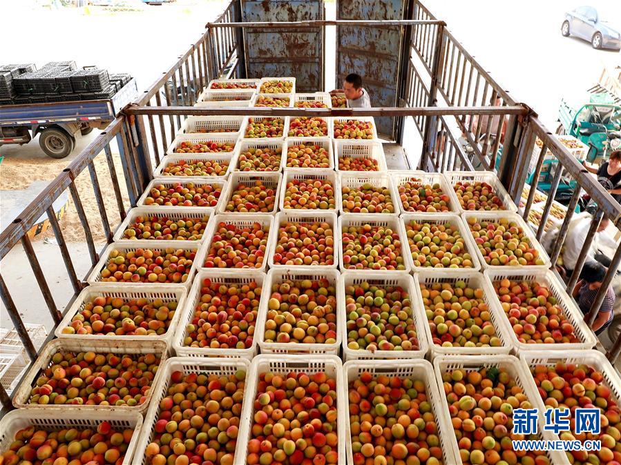 6月15日,在河北省巨鹿县一家鲜杏收购点,客商将红杏装车准备外运。新华社记者 牟宇 摄