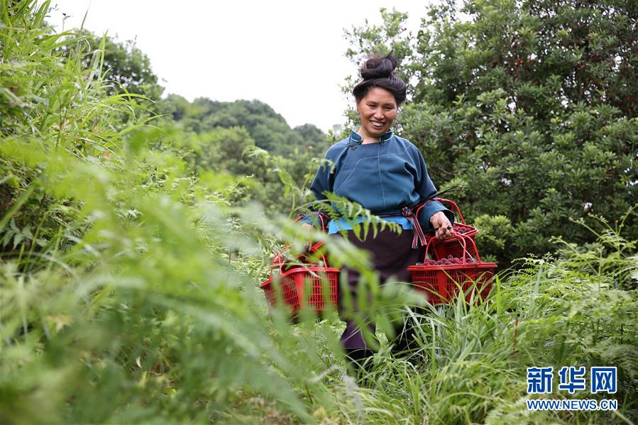 6月15日,在丹寨县扬武镇老冬村杨梅种植园,果农在转运采摘的杨梅。新华社发(黄晓海 摄)