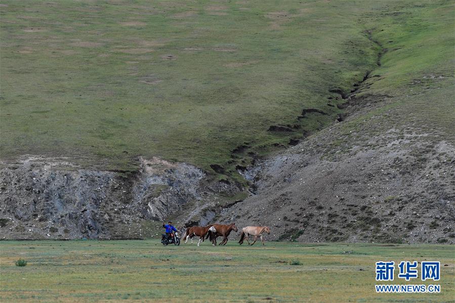 6月16日,在蒙古国中央省牧区,一名牧民骑摩托放牧。 新华社记者刘磊摄